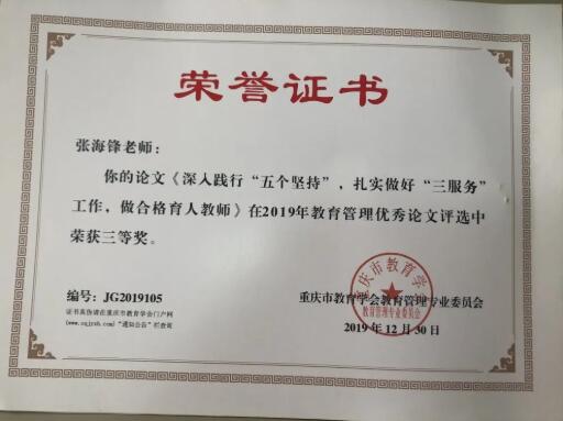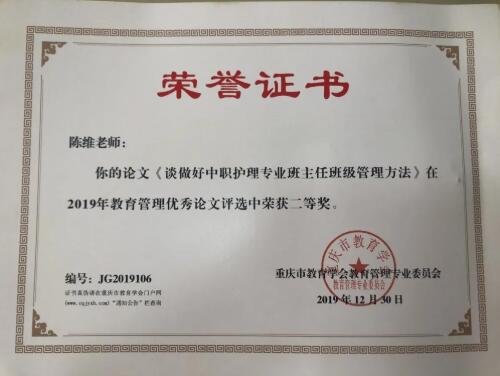 近日,重庆市南川职业中学校现代服务产业系教师陈维、孙保辉、张海锋在重庆市教育学会教学管理专委会组织开展的2019年教育管理优秀论文评选活动中获奖。